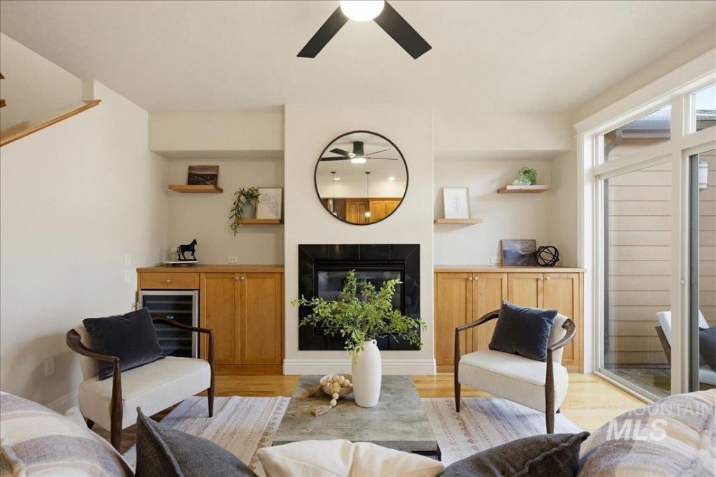 Ideally located in Southeast Boise, this low-maintenance home offers amazing proximity to downtown, local parks, the Boise River, and Greenbelt - perfectly suited for a carefree, lock-and-leave lifestyle. Floor-to-ceiling windows fill the open-concept layout with natural light, framing a picture-perfect courtyard designed for easy mornings and relaxed afternoons in complete privacy. Real birch hardwood floors and updated modern lighting elevate the homes refined feel throughout. The gourmet kitchen features custom alder cabinetry, GE Profile appliances, a new microwave/oven combo, and a gas range?ideal for both everyday living and entertaining. The great room is anchored by a cozy gas fireplace, built-ins, and a wine fridge for added convenience. Unwind in the master suite beneath soaring ceilings or step out onto the private balcony to enjoy stunning views of Table Rock. The ensuite bath includes dual sinks, a separate tub and shower, and a spacious walk-in closet. Two additional bedrooms and a full bath complete the versatile upper level, while a main-level bedroom offers the ideal space for guests or a home office. The oversized two-car garage provides ample storage, and the HOA covers exterior maintenance, including paint, roof, landscaping, and common areas?ensuring true low-maintenance living.