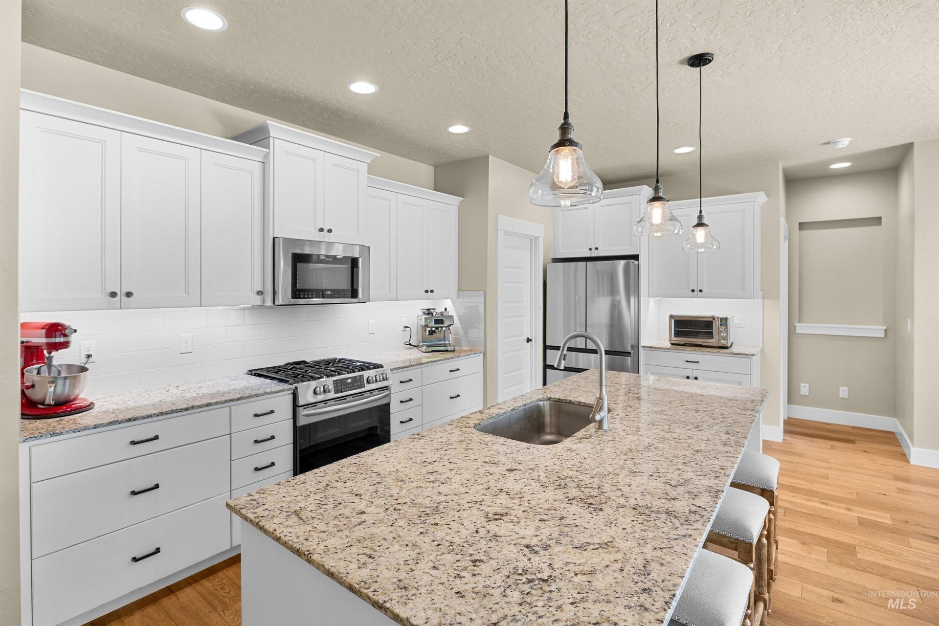 A modern, single-level home in a convenient South Boise location. The layout is efficient and well-designed, with thoughtful upgrades throughout. Wide-plank wood flooring runs through the main living areas and into the bedroom wings, creating a clean, continuous look. Tall ceilings and large windows bring in natural light and open up the great room. A stacked stone fireplace adds definition and warmth. The kitchen is spacious and functional, with custom white cabinetry, black hardware, stainless steel appliances, granite and tile finishes, a walk-in pantry, and a large island suited for everyday use and gathering. The floor plan offers separation between living and sleeping areas for privacy. The primary suite includes a well-appointed bathroom with dual vanities, a soaking tub, a tiled walk-in shower, and a large walk-in closet.