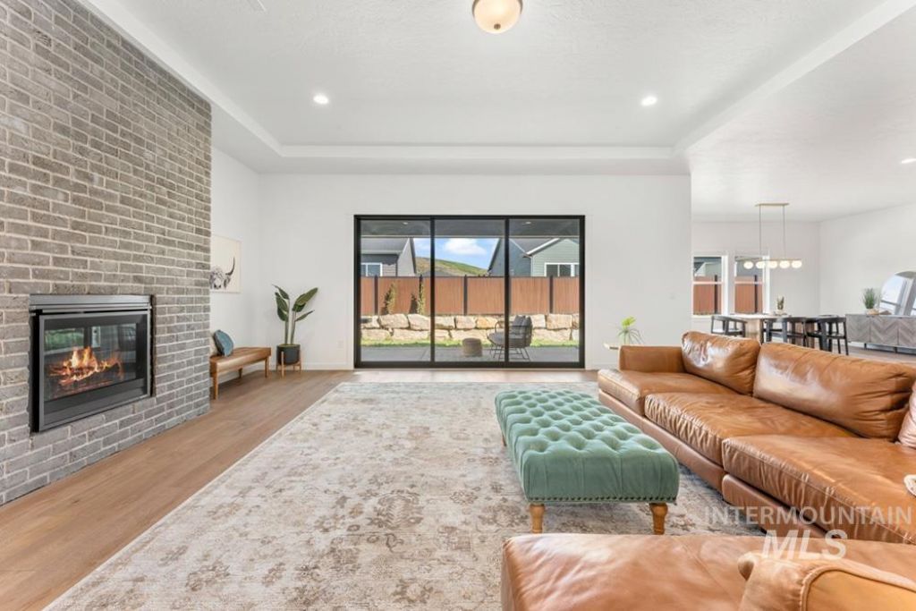A stylish & bright nearly new home with upgraded finishes, fixtures & appliances! Set at the end of a cul-de-sac, this single-level home offers the perks of new construction with a level of finish that goes beyond builder grade. Built by Toll Brothers as part of their luxury Riverbend collection, the home showcases thoughtful upgrades & intentional design. Tall ceilings & wide plank LVP flooring create a bright, open feel. The kitchen anchors the home with quartz countertops, warm brass hardware, shaker cabinetry & a full suite of stainless steel appliances, including double ovens, gas cooktop, microwave drawer & Café refrigerator. The great room is centered around a gas fireplace. Triple-stacking sliders open to the spacious backyard. The primary suite is privately positioned, offering a sophisticated ensuite bath with dual vanities, soaking tub, & frameless walk-in shower. Additional bedrooms all have attached baths, 2 of which are ensuite. Set on a .37 acre lot, the backyard offers space that is increasingly hard to find in newer construction, with room to add a pool, outdoor kitchen, or extended entertaining areas. Split 3-car garage provides ample space for cars, tools, & gear. Located within a fabulous community with a neighborhood pool, park, playground, & pickleball courts, the home also benefits from a central location with convenient access to both Star and Eagle.
