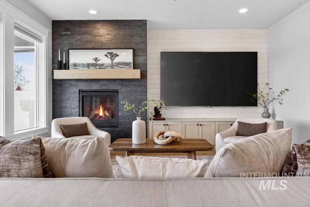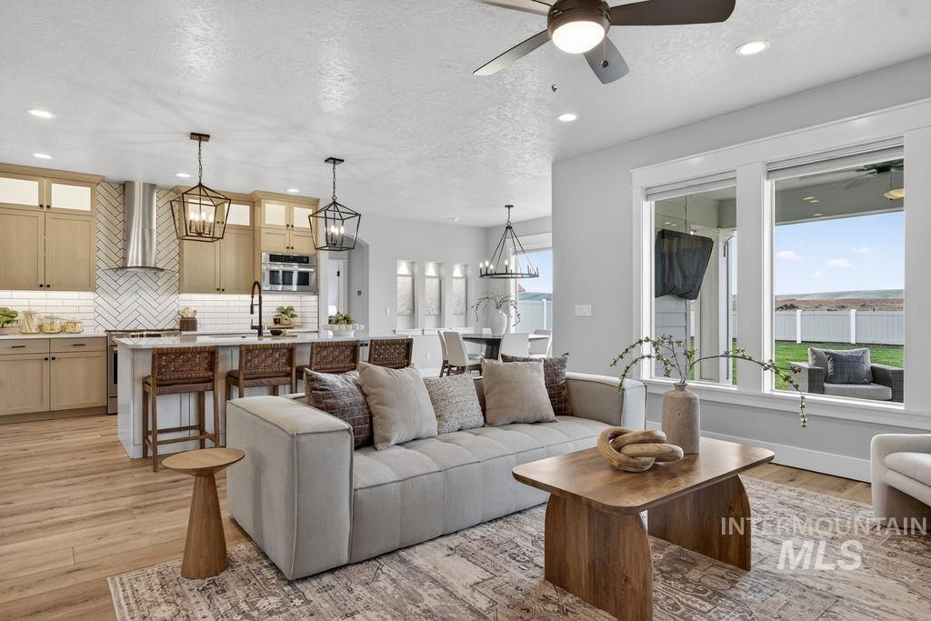 Nestled in the heart of Painted Ridge with no rear neighbors just minutes from Micron, local dining, shopping, and renowned outdoor recreation. Constructed by Eaglewood Homes, every detail reflects a seamless blend of elevated design and purposeful living. Rare, main-level master serves as a true retreat, featuring custom built-in nightstands and dresser along with direct access to a private patio. Lavish ensuite is complete with dual vanities, a soaker tub, built-in TV niche, and a spacious walk-in closet that connects to the laundry room for added convenience. Stunning chefs kitchen boasts quartz counters, gas range, expansive island with added storage, and a walk-in pantry complete with appliance shelving ? ideal for daily use and entertaining alike. Bright and airy great room is anchored by a striking black stone fireplace and 100-inch TV, creating the ultimate gathering space. Upstairs, a versatile bonus room provides versatility as a media room, office, or play area. Step outside to the covered patio with ceiling fan and outdoor TV overlooking lush, green grass maintained by a full auto sprinkler system and drip lines for potted plants. Two Nest thermostats, central vac plumbing, and ample storage closets speak to the incredible attention to detail woven throughout every corner of this home. Community pool and top-rated Boise schools complete this semi-custom masterpiece.