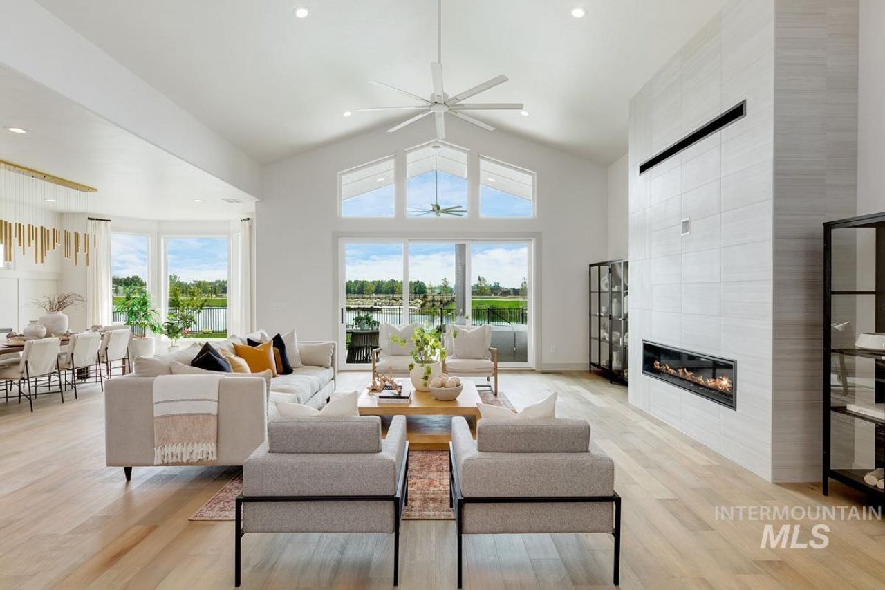 Located on the water with its own private beach, this single-level Cottonwood includes an RV garage and a spacious layout. A tall, welcoming entry opens to a large great room with vaulted ceilings and a 42 platform fireplace, creating a bright central living space. Large windows and a multi-slide door connect the great room to the covered patio for seamless indoor-outdoor living. The kitchen offers ample storage, handsome cabinetry, and an open dining area with bay windows. The primary suite enjoys massive windows with lakeshore views and a luxurious bath with a freestanding tub, tiled shower, and generous walk-in closet. A wine room, office, and expanded bedrooms complete the home. Now open, the River Park Estates Clubhouse offers endless opportunities for activity and relaxation presented in a beautiful modern aesthetic. Enjoy coveted community access to the Boise River, pickleball, swimming, lounge areas, and more. Home is under construction with a September, 2026 completion date. Photos similar.