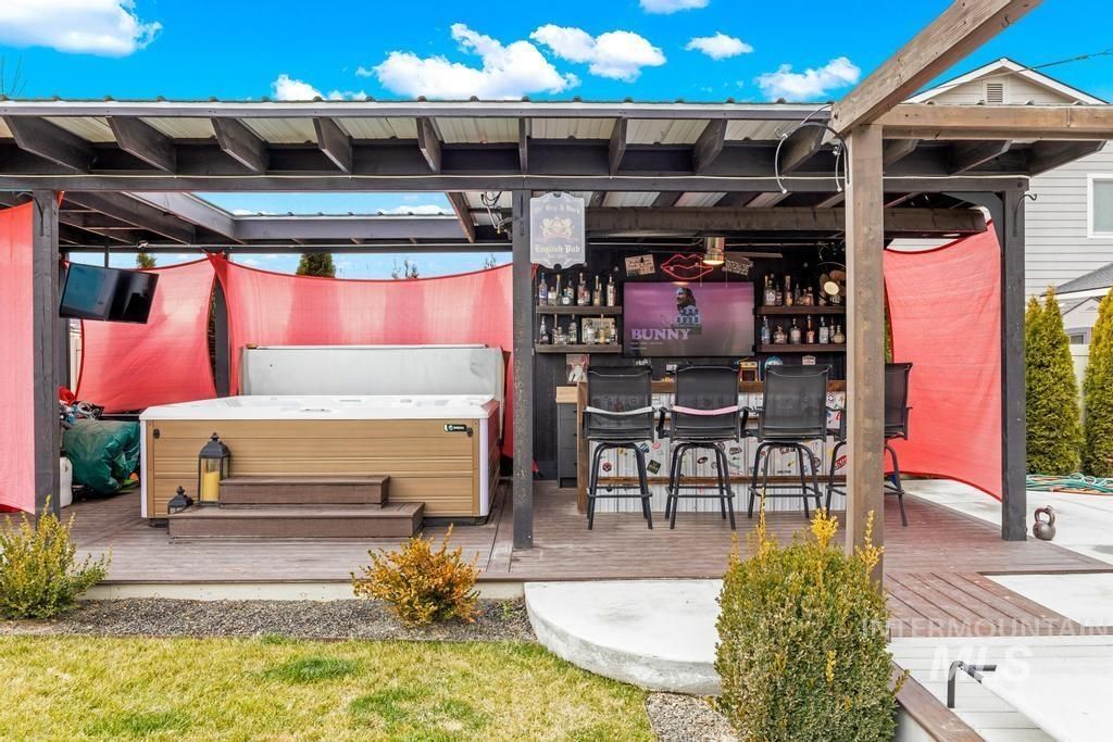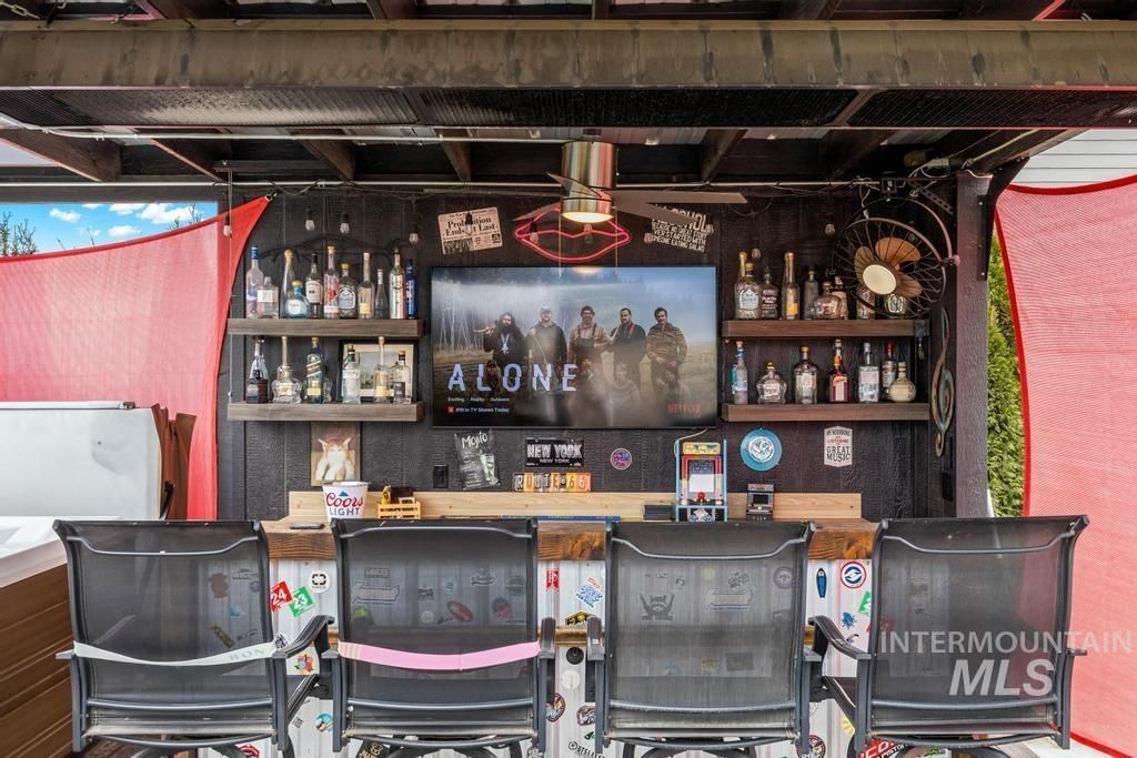 The backyard sets the tone for this home, designed as a fully covered outdoor living space built for true year-round enjoyment. With over 1,000 square feet of patio space built with durable Trex decking and integrated lighting system, the area creates a warm and inviting setting day or night. A commercial-grade overhead gas heating system allows comfortable use in every season, while a 10-person hot tub and fully built outdoor bar with mounted TVs, & gas fire pit, make the space ideal for entertaining or relaxing at home. Inside, the home showcases intentional design, custom millwork, and thoughtful upgrades throughout, including custom accent walls, barn doors, and detailed built-ins. The open main living area centers around a modern fireplace and abundant natural light. Dedicated office space features two-tone cabinetry, drawers & pull-out storage, a subway tile backsplash, & elegant lighting. Upstairs, the oversized primary suite offers a spacious retreat with a large soaker tub, dual vanities, and a custom-built walk-in closet with vanity space and integrated safe system. The finished garage includes custom cabinet build-outs, a built-in refrigerator, and ice machine. RV Parking. This home combines extensive upgrades, thoughtful design, and indoor-outdoor living in a way that stands apart from typical homes in the area. So many more upgrades, ASK AGENT FOR FEATURES LIST!